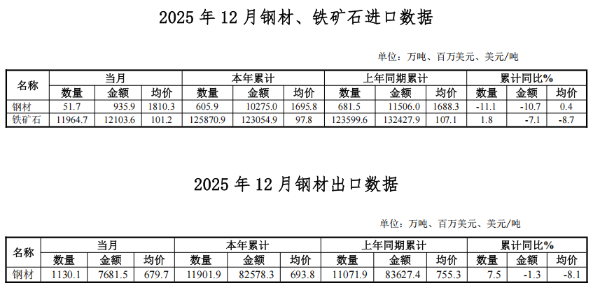 根據(jù)海關(guān)統(tǒng)計快訊數(shù)據(jù),2025年12月,我國進口鋼材51.7萬噸,環(huán)比增加2.1萬噸、增幅4.2%;均價1810.3美元/噸,環(huán)比上漲179.0美元/噸、漲幅11.0%。1-12月累計進口鋼材605.9萬噸,同比減少75.6萬噸、降幅11.1%。