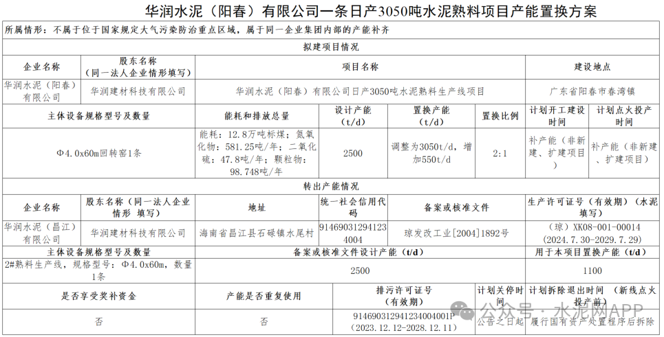 近日,廣東工信廳發(fā)布兩則華潤水泥補充熟料產(chǎn)能方案公告。置換方案顯示,華潤水泥(昌江)公司退出一條2500t/d熟料生產(chǎn)線,其中1100t/d產(chǎn)能用于華潤水泥(陽春)公司一條2500t/d熟料線,補齊后產(chǎn)能3050t/d,置換比例2:1;剩余1400t/d產(chǎn)能用于補充華潤水泥(惠州)公司一條2500t/d熟料線,補齊后產(chǎn)能3200t/d,置換比例2:1。