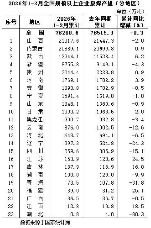 2026年1-2月份全國規(guī)模以上分省區(qū)原煤產(chǎn)量數(shù)據(jù)發(fā)布